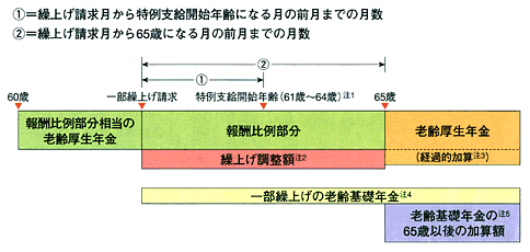「全部繰上げ」は60歳から65歳前までの間に請求できますが、「一部繰上げ」は60歳から特例支給開始年齢になる月の前月までの間に請求することになっています。 |